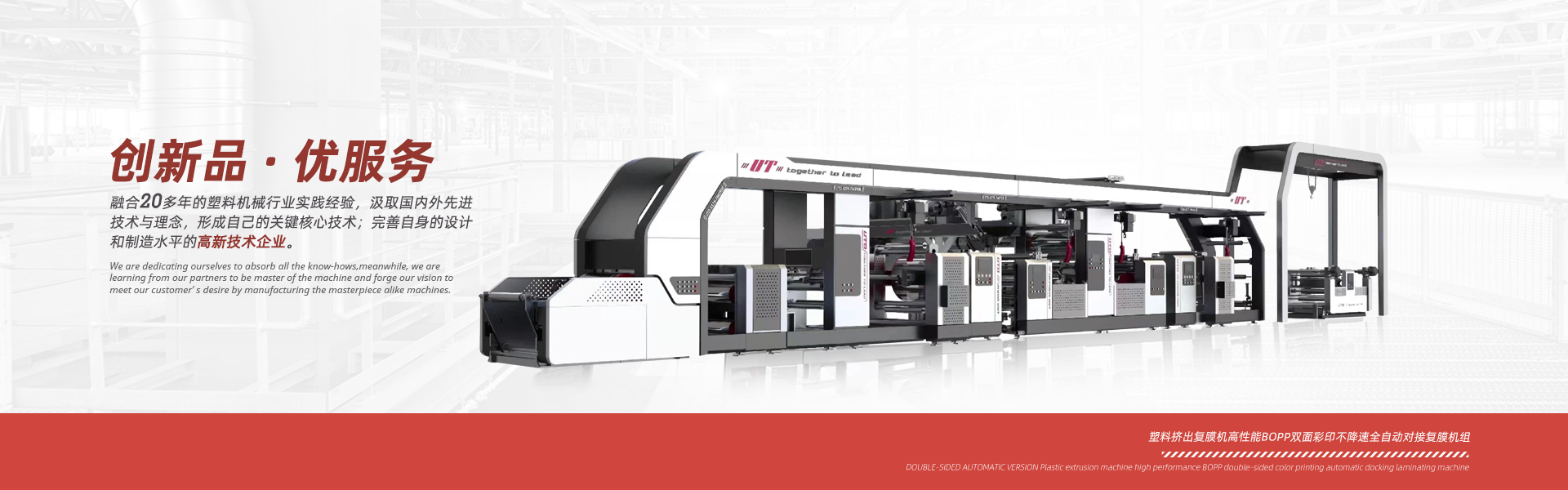 優(yōu)特機械精心致力于塑料編織行業、紙塑軟包裝行業、輪胎制造行業等成套生產設備的設計和制造,并為用戶提供生產工藝及培訓。我們的服務范圍包括各類塑料覆膜機、紙張覆膜機、BOPP彩印膜雙面自動對版覆膜機、 紙塑邊縫三合一覆膜機、中縫印刷制袋機、以及輪胎行業循環(huán)回收使用的隔離膜生產線。